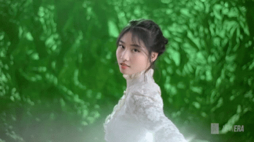 JKT48 member Mutiara Azzahra in a white dress, smiling against a green background, from 'Dialog Dengan Kenari'.