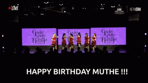 JKT48 members celebrate Muthe's birthday on stage, with a 'Happy Birthday Muthe' message displayed.