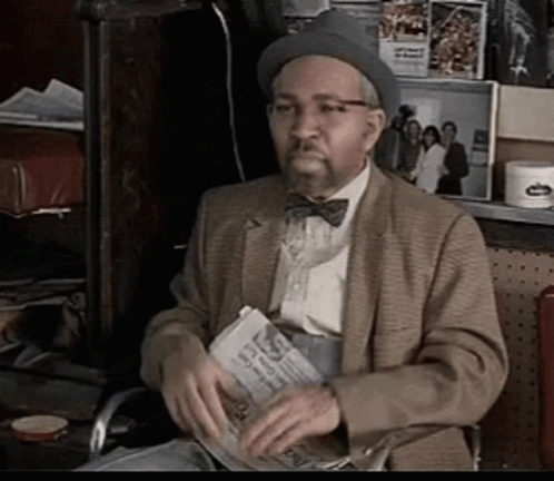 Jnyce Saul, in character, reacts in a barbershop setting, holding a newspaper.