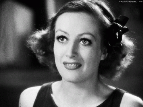 Joan Crawford with an optimistic smile, wearing a bow in her hair in this classic black and white shot.