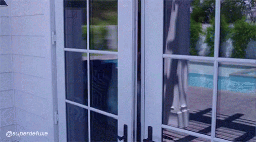 Joanne the Scammer, in a furry coat, dramatically exits through French doors to a poolside patio.