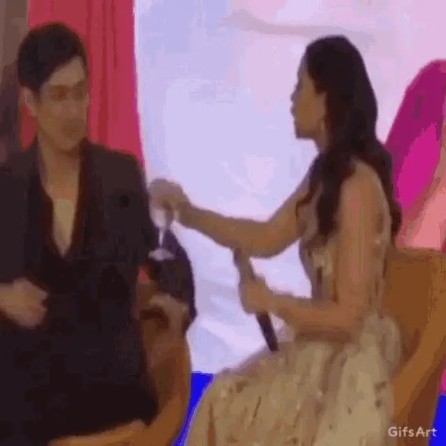 Jochard and a woman share a playful moment on stage during their Mall Tour, leaning in close and laughing.