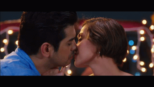 Jodi Sta Maria and Ian Veneracion share a tender kiss, illuminated by festive lights in a romantic scene.
