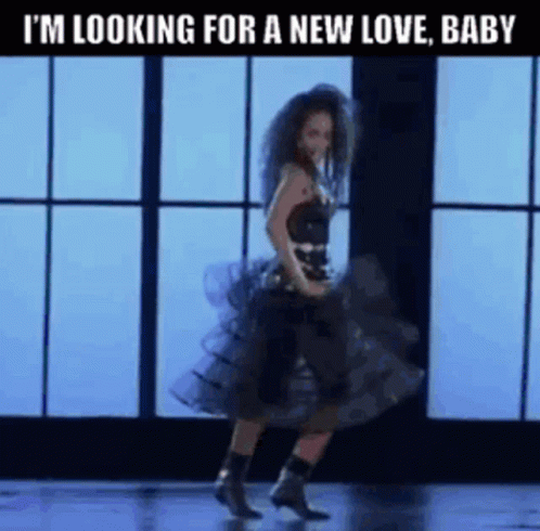 Jody Watley performs a dynamic dance, embodying the lyrics "I'M LOOKING FOR A NEW LOVE, BABY" from her hit song.