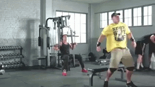John Cena energetically dances and works out in a gym, wearing his iconic yellow shirt.