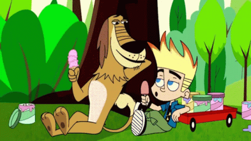 Johnny Test and his dog Dukey share a happy moment enjoying delicious ice cream treats.