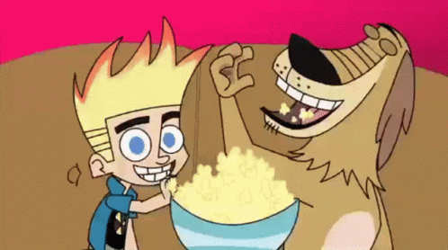 Johnny Test and his dog Dukey enjoy a bowl of popcorn, ready for a movie night.