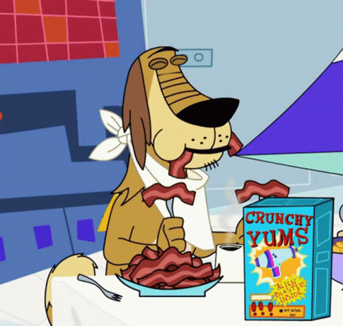 Dukey from Johnny Test enjoys a large plate of bacon for breakfast, with a box of Crunchy Yums nearby.