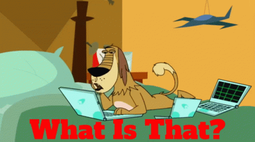 Dukey from Johnny Test looks stressed while working on two laptops, questioning 'What Is That?'