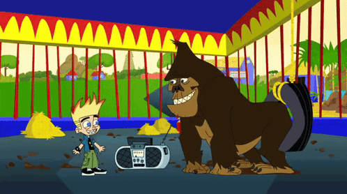 Johnny Test and a gorilla show off their dance moves with a boombox in a lively cartoon scene.