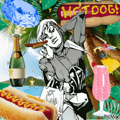 Jodio (Usagi Alohaoe) from Jojo's Bizarre Adventure Part 9, surrounded by hot dogs, champagne, and tropical elements.