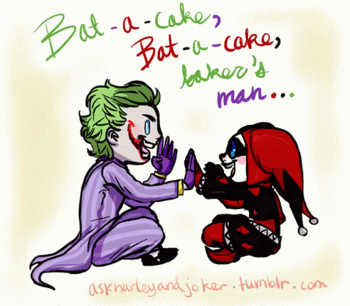 Chibi versions of Joker and Harley Quinn joyfully playing pat-a-cake, with the rhyme "Bat-a-cake, Bat-a-cake, baker's man...".
