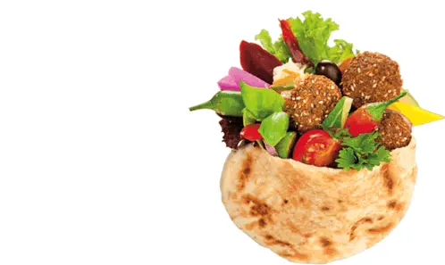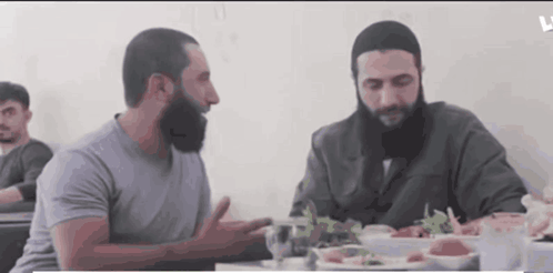 Ahmad Alshara and Jolani share a meal of falafel and salad at a table, engaged in conversation.