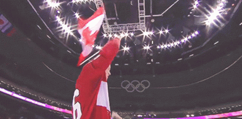 Jonathan Toews proudly waves the Canadian flag, celebrating with Team Canada at the Olympics in a brightly lit arena.