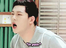 K-pop idol Jooheon expresses discomfort or pain, with the caption 'in pain' visible on screen.