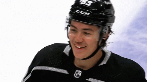 Jordan Spence of the LA Kings smiles on the ice, wearing his hockey uniform and helmet.