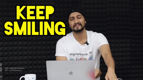 Digital Pratik of Jorrparivar shares a positive message to 'Keep Smiling' while sitting with his laptop.