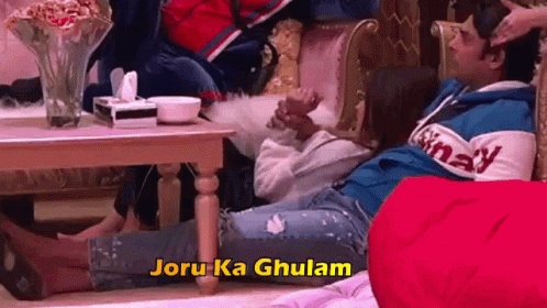 Sidharth and Shehnaaz share a sweet moment on the couch, with the phrase "Joru Ka Ghulam" displayed.