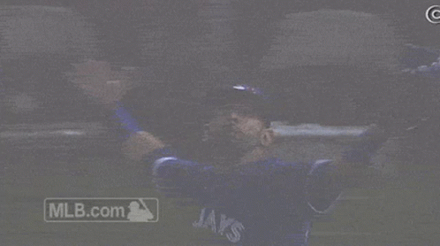 Jose Bautista, a Toronto Blue Jays player, looks up with outstretched arms during a foggy baseball game.
