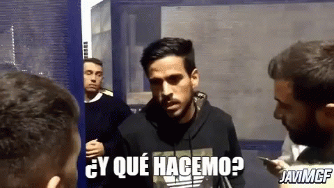 Jose Recio, wearing a black hoodie, asks 'What do we do?' while talking to a group of men.