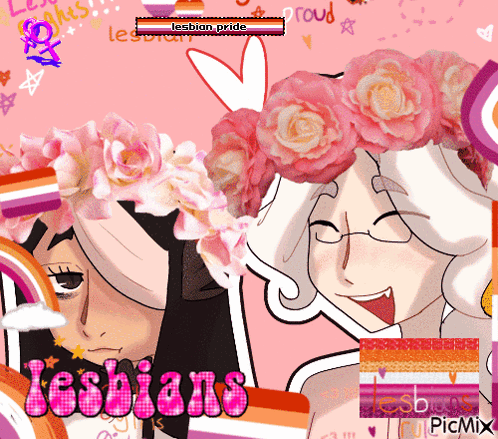 a drawing of two girls with flowers in their hair and the words lesbians on the bottom