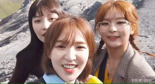 Red Velvet's Joy, Wendy, and Seulgi (Jowenseul) share a fun group selfie, smiling and posing.