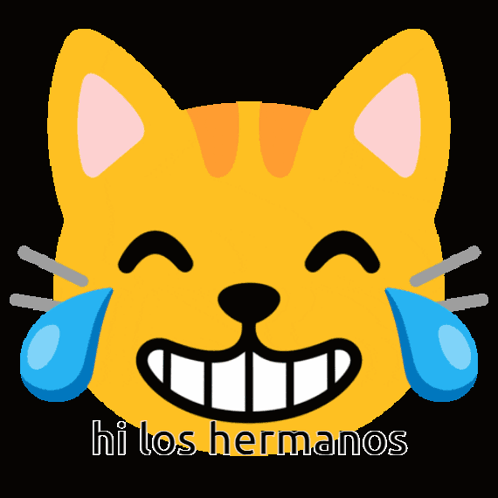 A laughing yellow cat emoji with tears of joy and the Spanish phrase 'hi los hermanos' (hi the brothers) below it.