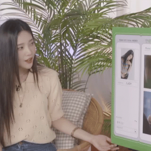 Red Velvet's Joy (Park Sooyoung) gestures while explaining content displayed on a screen next to her.