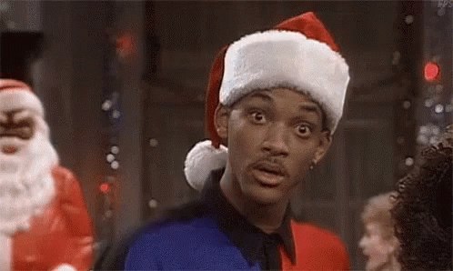 Will Smith looks surprised and confused while wearing a Santa hat, with a Santa figure in the background.