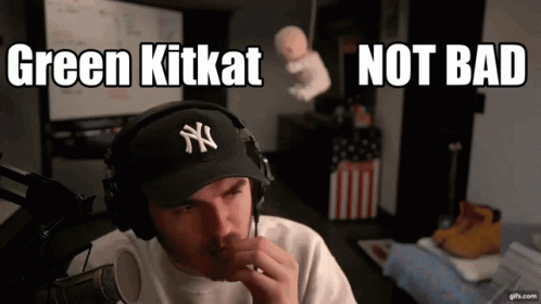 Jschlatt, wearing a New York Yankees hat and headphones, tastes a green Kitkat and reacts positively, saying "Not Bad".