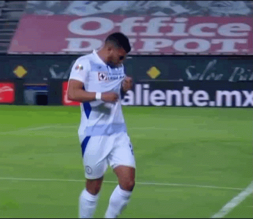 Juan Escobar, a player for Cruz Azul, celebrates on the soccer field, pointing upwards after a goal.