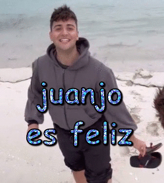Juanjo Bona stands on a beach with the text 'Juanjo es feliz' (Juanjo is happy) displayed.