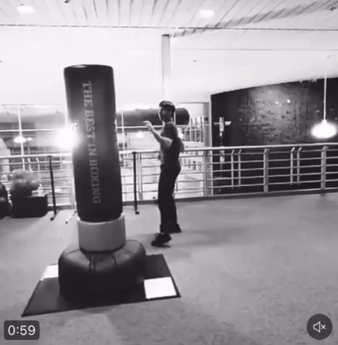 A man demonstrates various martial arts techniques, including punches and kicks, on a freestanding boxing bag in a gym.