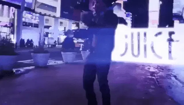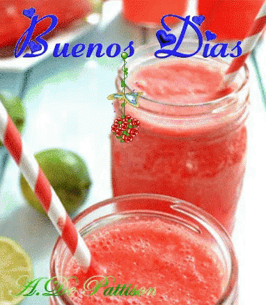 Two glasses of refreshing watermelon juice with straws, featuring a 'Buenos Días' message.