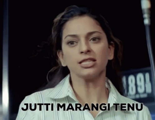 Juhi Chawla delivers a classic "Jutti Marangi Tenu" threat with an angry, annoyed expression.