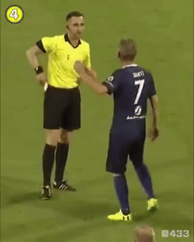 A soccer referee playfully shows a card to a player, creating a humorous moment on the field.
