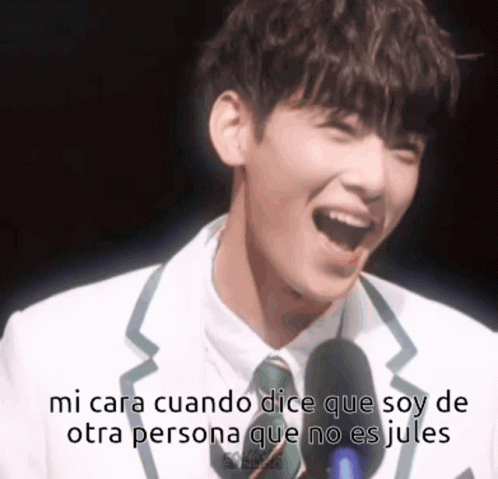 Jules Dongmin (Eunwoo) laughing heartily into a microphone, with a Spanish caption about being someone else's.