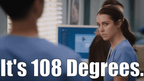 Jules Millin (Adelaide Kane) in scrubs reacts to the extreme heat, stating 'It's 108 Degrees' in a hospital setting.
