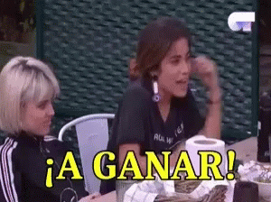 Julia Medina and Alba Reche show excitement, cheering '¡A GANAR!' with a fist pump at the table.
