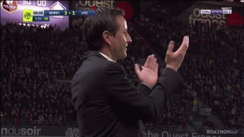 Julien Stephan, coach of Rennes, claps and smiles after his team's 3-1 victory against LOSC at the 90-minute mark.