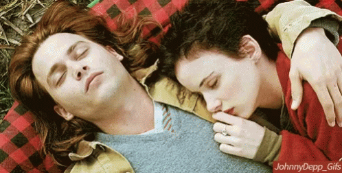 Johnny Depp and Juliette Lewis share a tender moment, resting on a plaid blanket in a scene from Gilbert Grape.