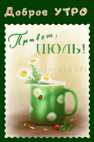 A cheerful green mug with daisies and a ladybug, wishing a good morning and a happy July.