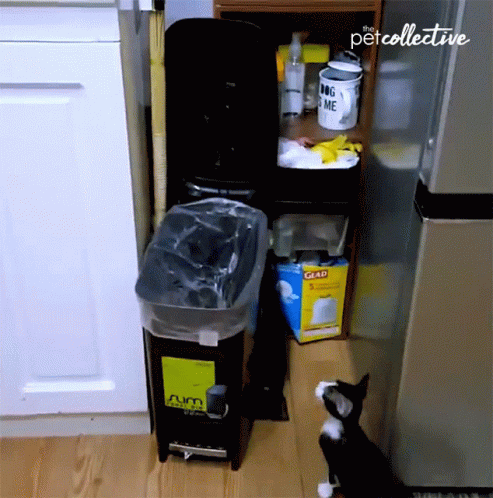 A cat attempts a jump onto a trash can but hilariously misjudges the landing and tumbles inside.