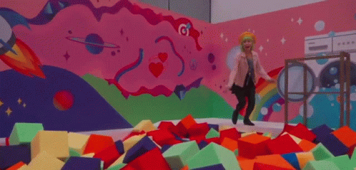 Goldie Chan, with vibrant green hair, joyfully runs and jumps into a large pit filled with colorful foam cubes.