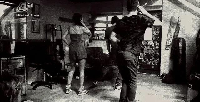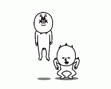 Two simple cartoon characters with faces are shown jumping and squatting, conveying excitement and energy.