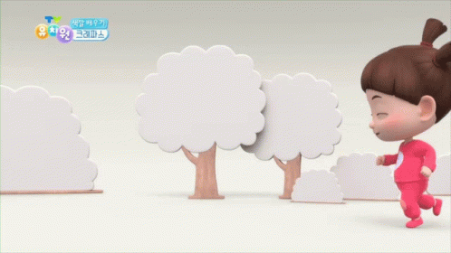 Cartoon girl Kkoya in pink pajamas jumps and skips, interacting with a chicken and an egg.