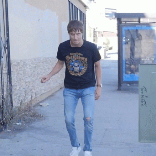 Danny Mullen jumps and turns around on a sidewalk next to a building and a bus stop.