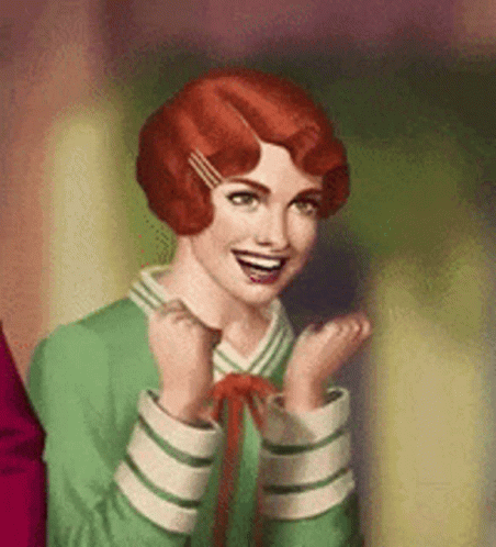 Virginia Van Buren from June's Journey, happy and excited in a green dress.