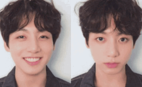 Jungkook's contrasting expressions, from a bright smile to a serious gaze, for the Koofist meme template.