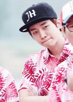 Junho of 2PM, wearing a 'JH' cap and tropical shirt, gives an unimpressed or pensive look.